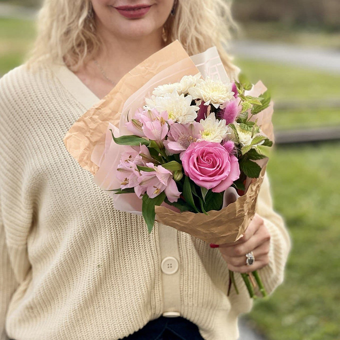 Букет "Сливочный десерт " с розой, с альстромерией и хризантемой